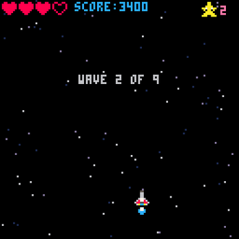 Try to kill as many aliens as possible while progressing through 10 waves. You can shoot by holding X. Each wave increases in difficulty. You have 4 lives, but can gain a life if you collect 10 power stars. You can turn power stars into a spreadshot, with more bullets per star you have collected; press the Z key. On the final wave, there is a boss battle, which may present itself as somewhat challenging.